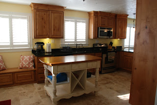 After: The new and improved kitchen. We updated the kitchen with new knotty alder cabinets, and dark granite counter tops. I added a bench under the far window to the right because it is near the back door and the kids can use it to take off their winter clothing. I added an island that has an antique destressed finish on the bottom and a solid wood surface on top that matches the knotty alder cabinets. I added lighting under the cabinets to light up the work surfaces and Mark and I laid the travertine floor.